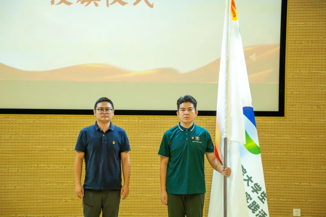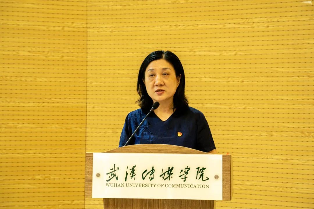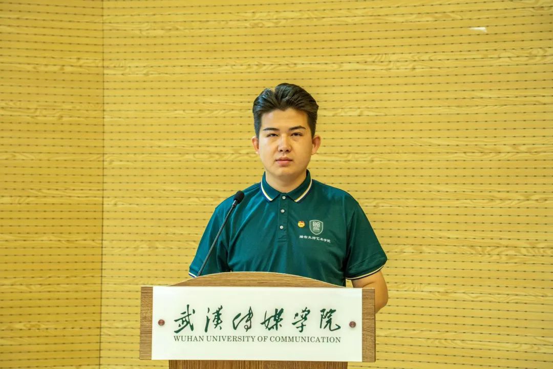 校团委书记瞿宗巍介绍武汉传媒学院2023年暑期“三下乡”社会实践活动准备情况,党委学生工作部部长余恺为团队代表授旗。