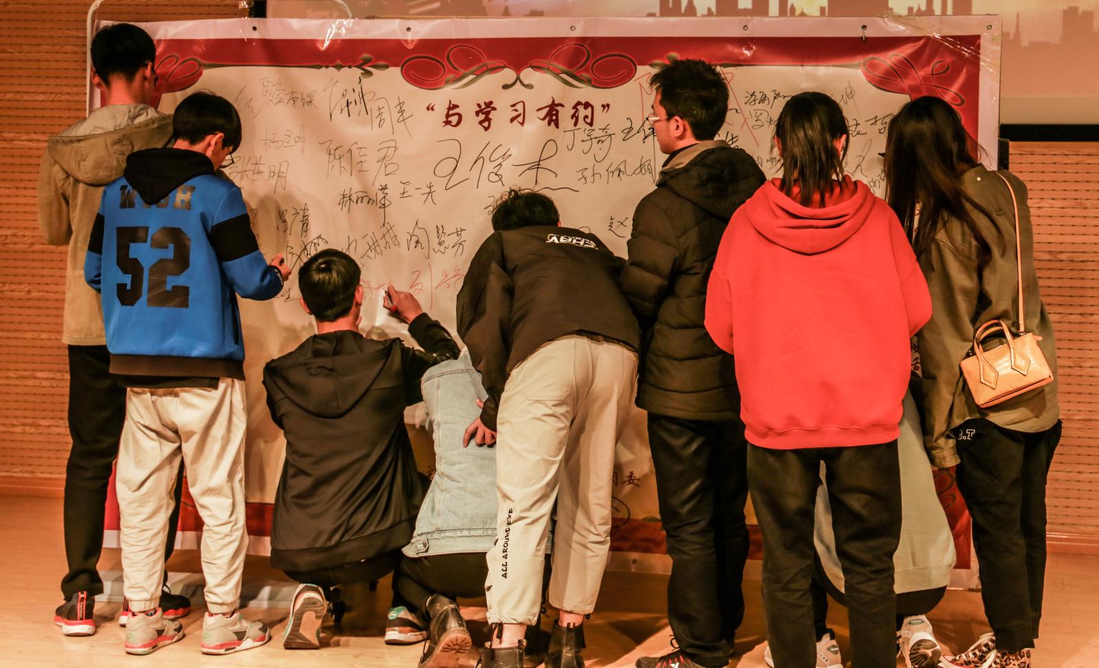 在学生代表带领在场学生进行宣誓后,传媒技术学院2019年“与学习有约”学风建设活动正式启动,在场师生在签名墙上签名并合影留念。