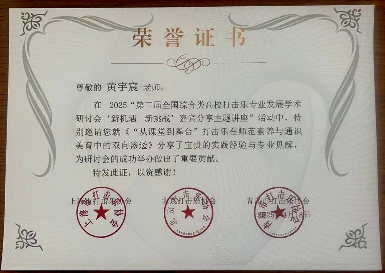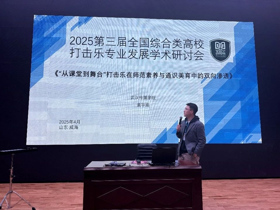 4月18日至20日,由中国三大打击乐协会联合发起、山东大学(威海)艺术学院等单位承办的第三届全国综合类高校打击乐专业发展学术研讨会在威海举行。武汉传媒学院首次以协办单位身份参与此次盛会,人文与艺术学院音乐系青年教师黄宇宸受邀作主题讲座,为学校赢得业内广泛关注。