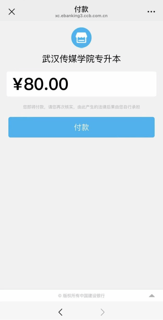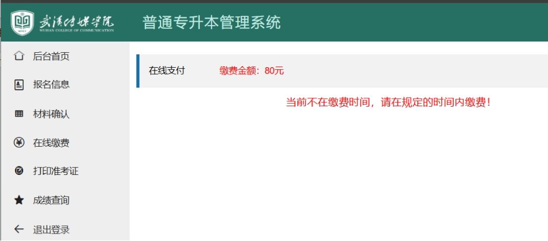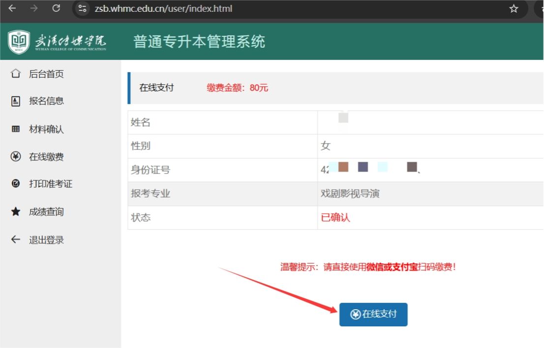 上传后的材料,由学校老师逐一进行审核,通过后可在线缴费。点击“在线缴费”菜单,系统显示用户信息、缴费金额等,核实无误后点击“在线支付”按钮,系统弹出支付二维码,使用微信或支付宝扫码支付,支付成功后系统自动跳转到缴费详情页面。