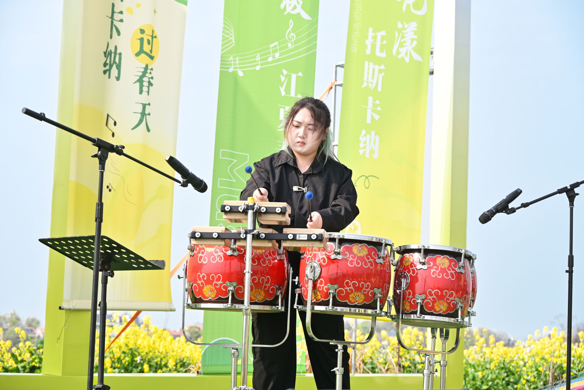 当日下午三时,阳光和煦,万亩油菜花竞相盛放,微风拂过,金色花海泛起层层涟漪。随着打击乐《初醒》的清脆律动响起,演出正式拉开帷幕,明快的节奏如晨露滴落,轻轻唤醒了沉睡的花田与春日。紧接着,经典曲目《我的太阳》从景区塔顶缓缓传来,旋律悠扬,与脚下的金色花海交相辉映,观众循声望去,只见学生们伫立在田埂之上,身影与花海、蓝天融为一体,氛围感拉满。